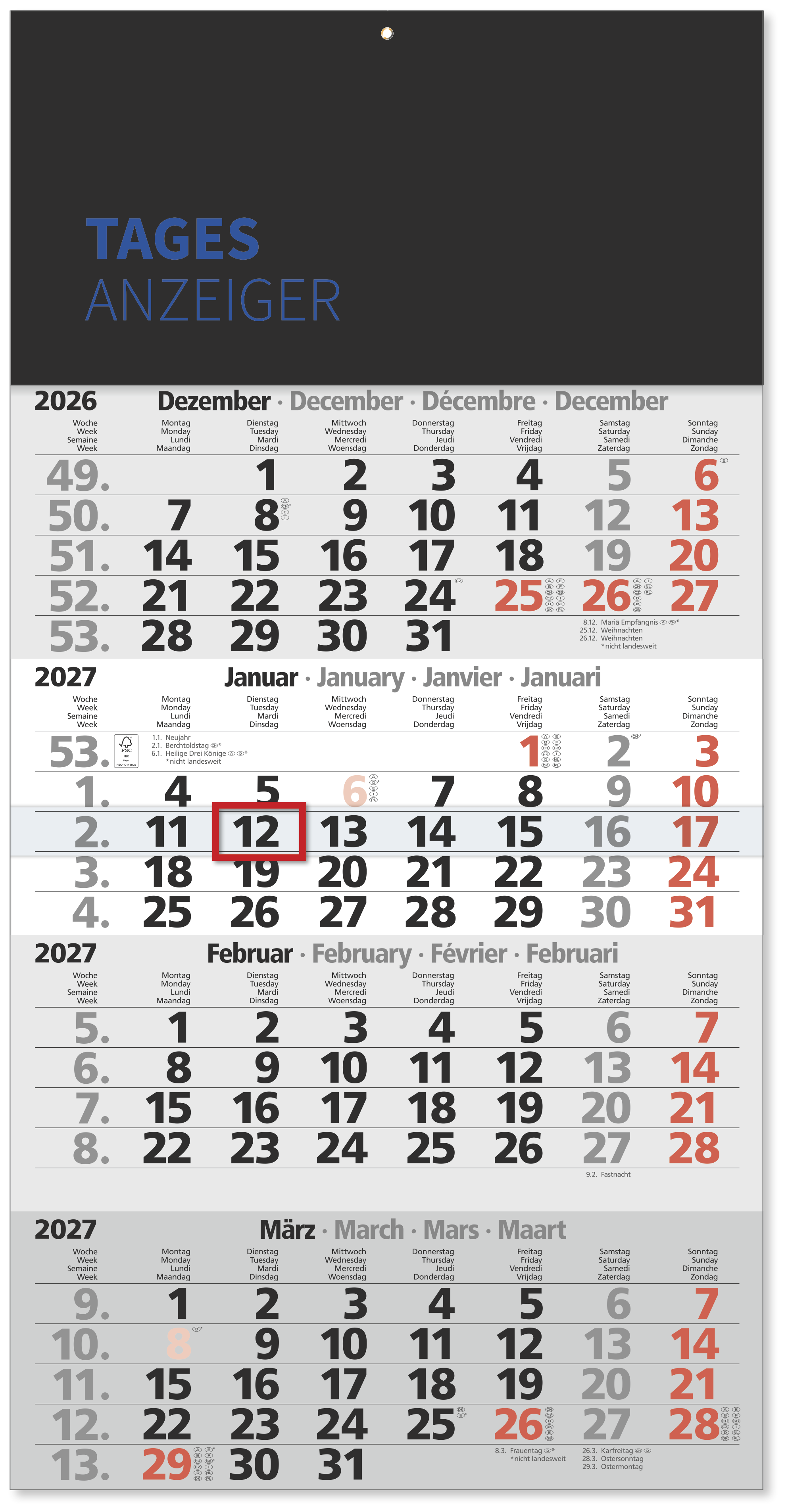 Der 4-Monatskalender “Tagesanzeiger” 2026 präsentiert jeweils vier Monate auf einem Blatt – insgesamt 12 Monatsblätter in einem durchgängigen Kalenderblock (Format 30 × 59 cm). Die Abreißperforation sorgt für sauberes Entfernen verbrauchter Blätter, die Querperforation im Kalendarium ermöglicht eine einfache Falzung für den portosparenden Versand im B4-Umschlag.