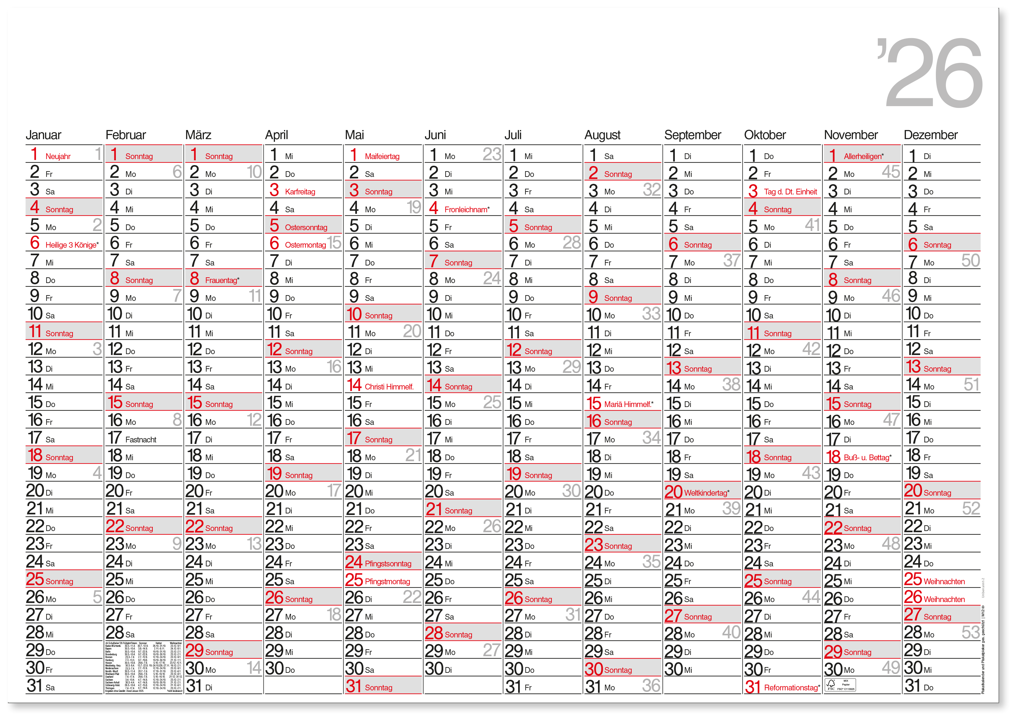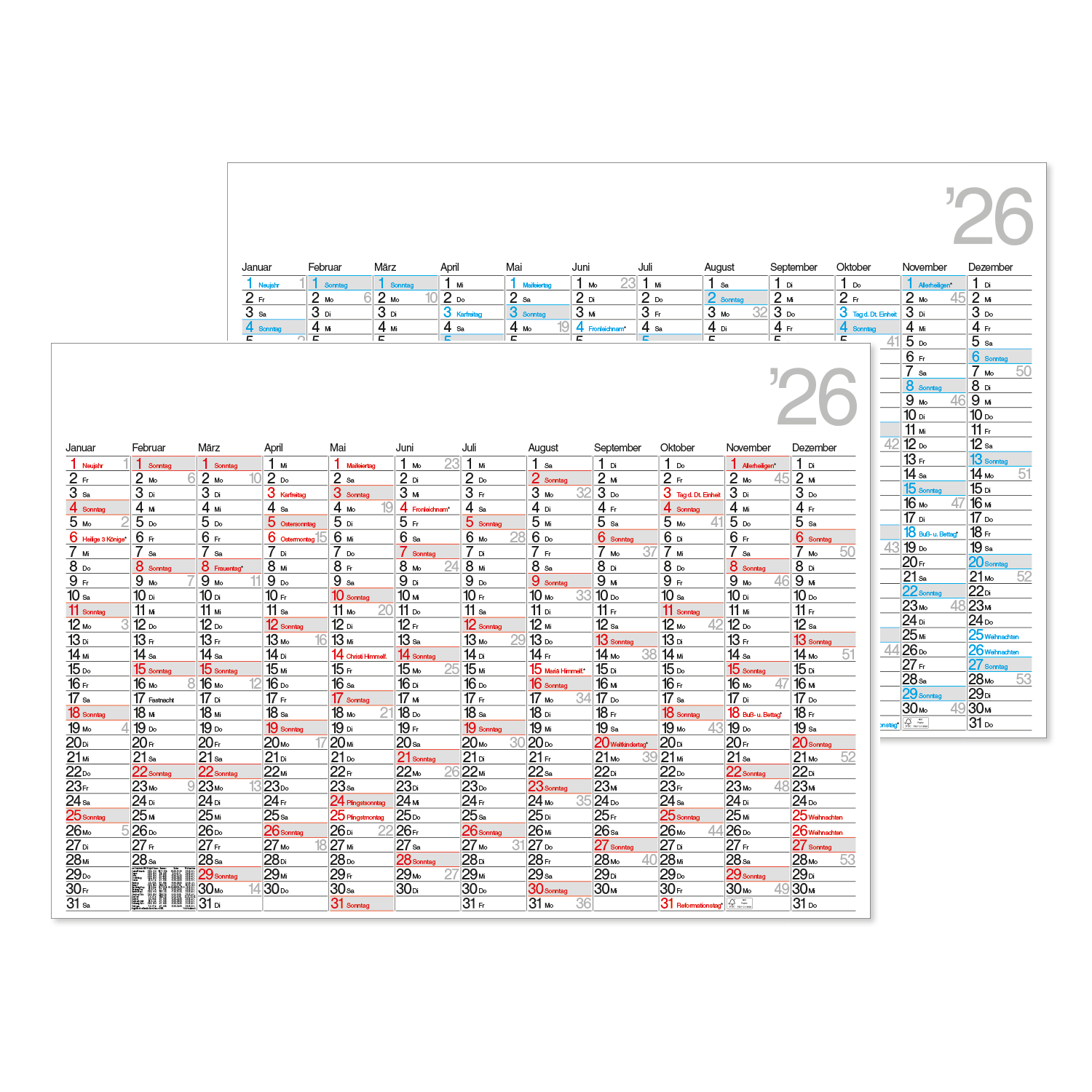 Das Kalendarium ist deutschsprachig mit einsprachigen Tages- und Monatsnamen sowie gut sichtbarer Wochenmarkierung. Sonn- und Feiertage sind in Blau, Werktage in Schwarz gehalten. Zusätzlich sind alle Schulferientermine der Bundesländer vermerkt. Auf Wunsch ist das Kalendarium auch in 1 oder 2 Sonderfarben erhältlich.