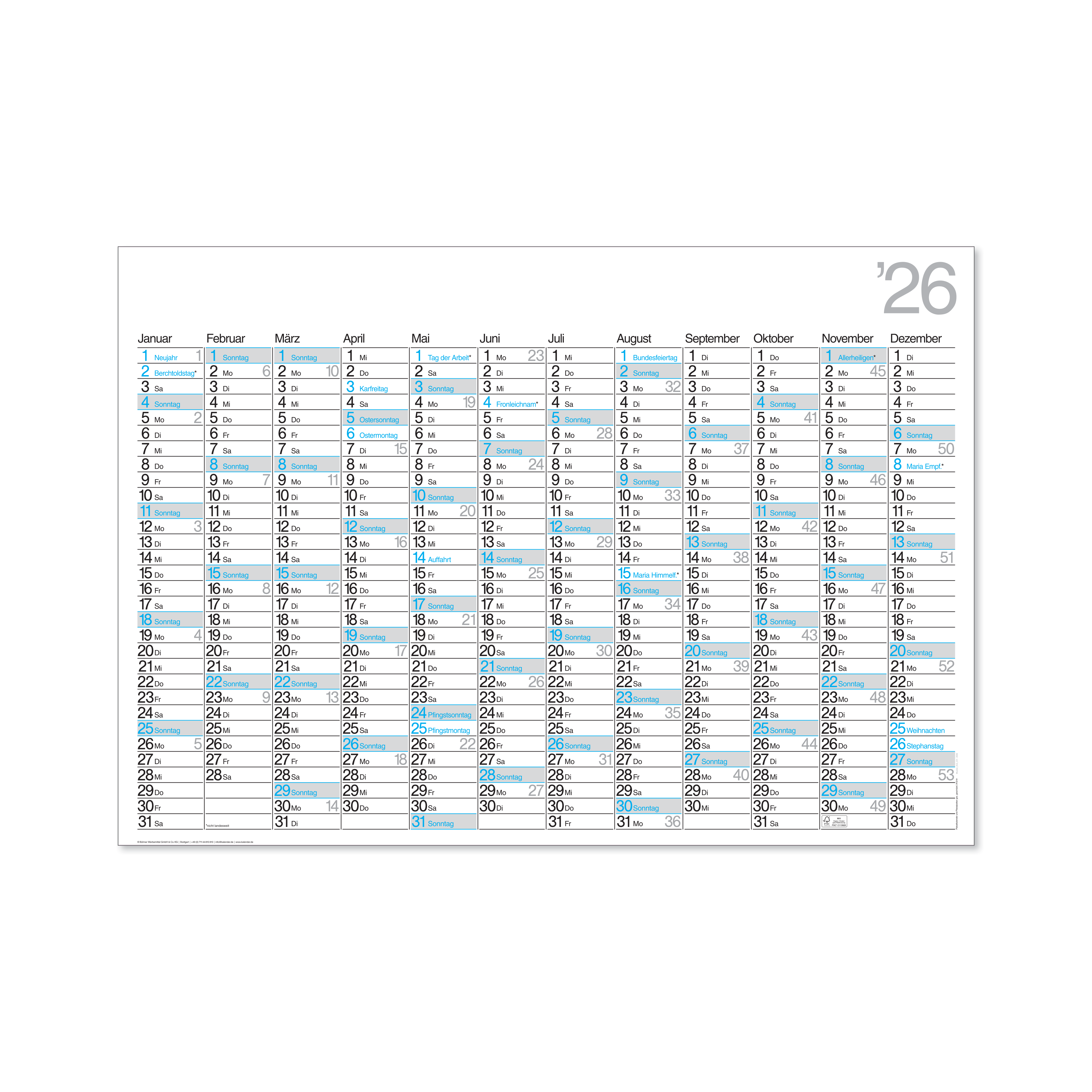 Der Plakatkalender 12 Monate in Schweizer Ausführung bietet Ihnen eine übersichtliche Darstellung des gesamten Jahres. Mit seinem großzügigen Format von 98 × 68,5 cm eignet er sich perfekt für Büros, Schulen, Praxen oder den privaten Gebrauch. Das Kalendarium in deutscher Sprache enthält Kalenderwochen und ausführliche Feiertagsbezeichnungen für die Schweiz. Die Sonn- und Feiertage sind wahlweise in Blau (HKS 47) oder Rot (HKS 14) gedruckt, Sonntage zusätzlich grau hinterlegt.