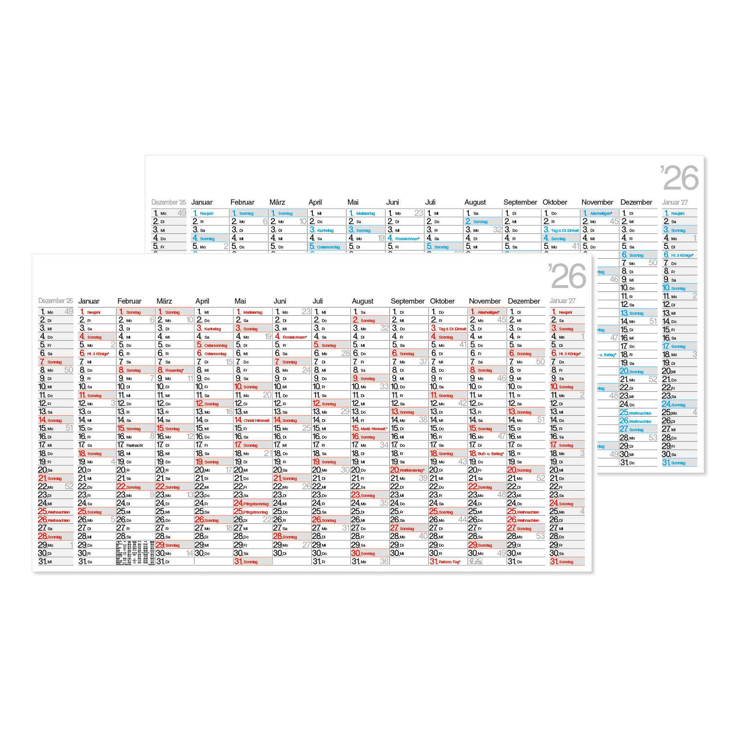 Die Sonntage sind grau hinterlegt, während Sonn- und Feiertage wahlweise in Rot oder Blau gedruckt sind. Die Wochentage erscheinen in Schwarz, wodurch der Kalender eine klare und gut lesbare Struktur erhält. Neben den ausführlichen Feiertagsbezeichnungen für Deutschland sind auch die Ferientermine aller Bundesländer enthalten – so behalten Sie wichtige Termine jederzeit im Blick.